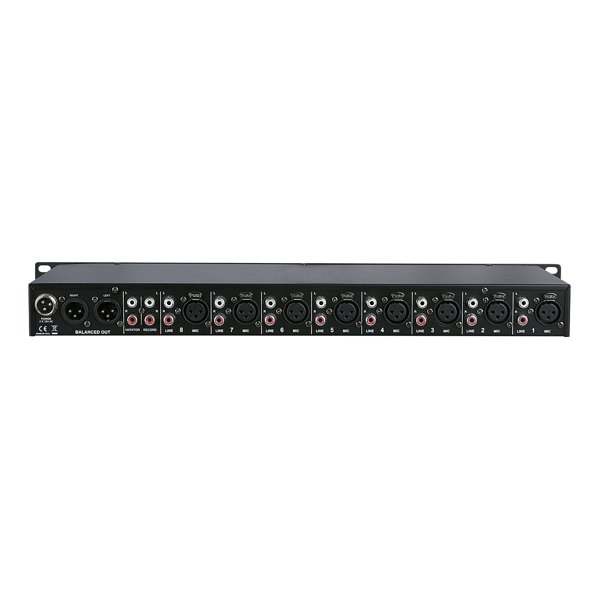 De Compact 8.1 is een hoogwaardige 19″ 1HE line-mixer. Met een aantal intelligente functies onderscheidt deze mixer zichzelf van andere compacte mixers. Alle inputs kunnen op microfoon- of line-niveau gebruikt worden en hebben high-pass-filters en afzonderlijke keuzeschakelaars voor de fantoomvoeding. Het heeft een gebalanceerde master-output, een opname-output en een monitor-output. Het koptelefoon-niveau beïnvloedt ook de monitor-output waardoor dit een onafhankelijke extra output is voor een tweede gebied of zone. De hoofd-EQ heeft een mid-frequentiesweep waarmee u de feedback-frequentie van uw systeem kunt elimineren wanneer u de Compact 8.1 als een microfoon-mixer gebruikt.