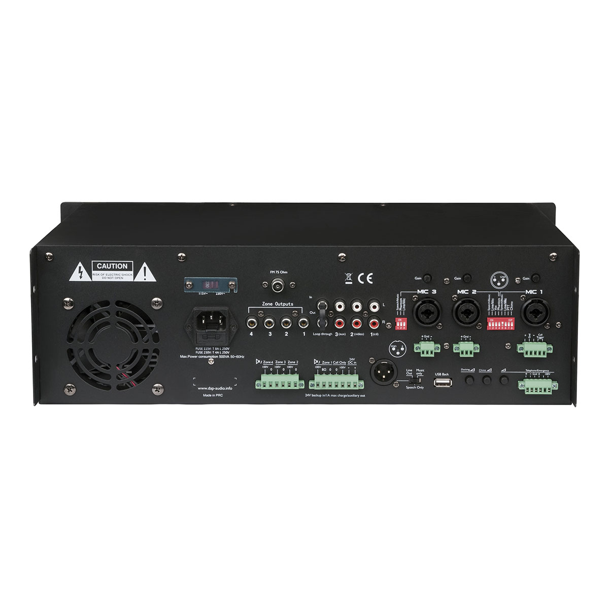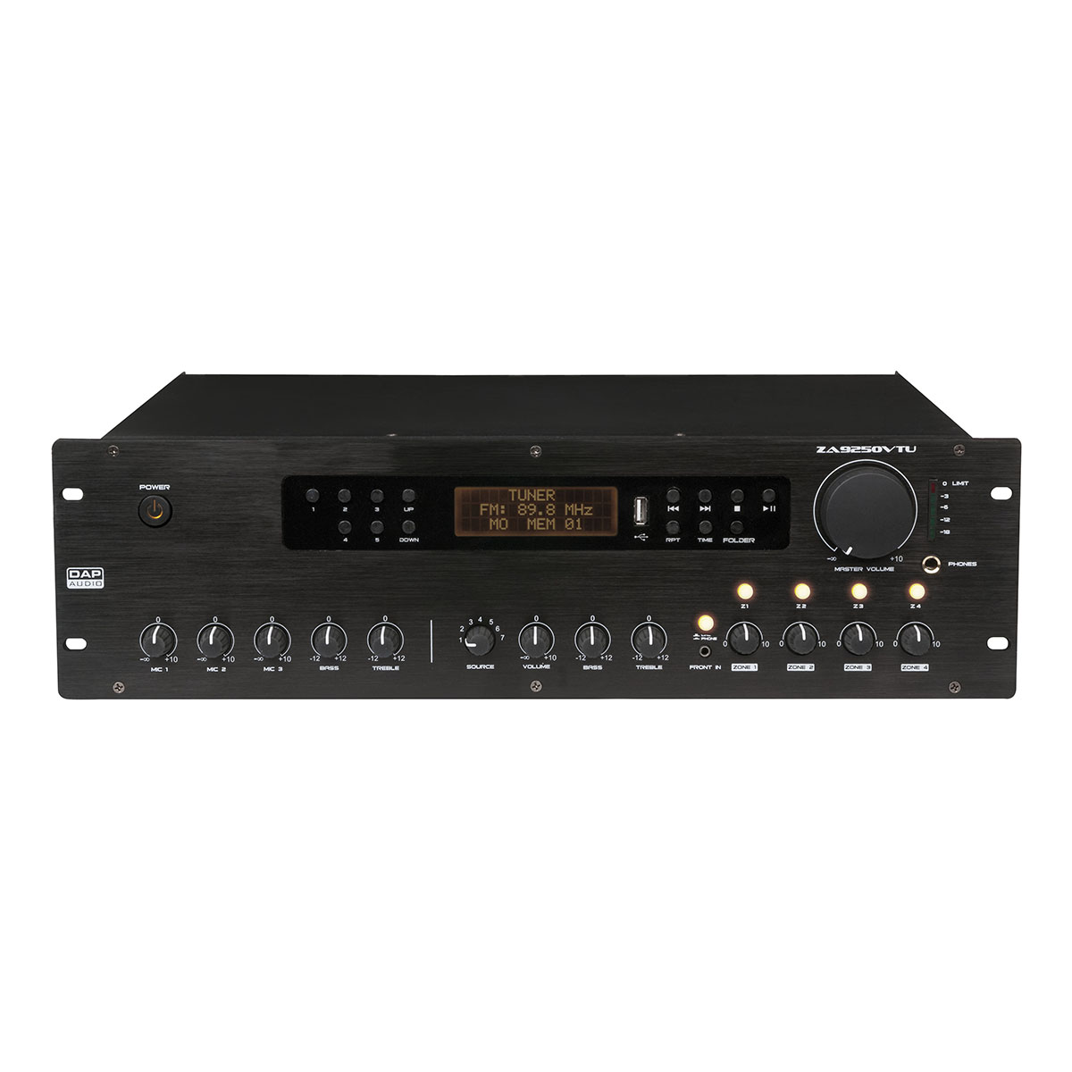 De DAP ZA-9250VTU is een 250 W 100 V 4-zone mengversterker en mediaspeler met volumeregeling per zone. De 3 microfoon-/lijningangen zijn uitgerust met +48 V fantoomvoeding en je hebt de keuze uit 7 audiobronnen, waaronder een ingebouwde USB-speler met twee USB-ingangen (voor- en achterkant) en FM-tuner van waaruit je tot 10 audiostations kunt opslaan.