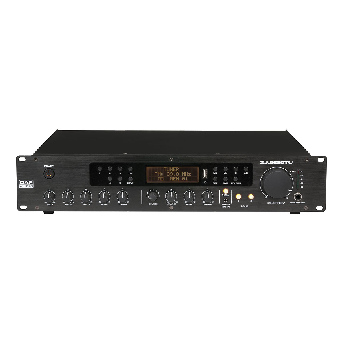 Verder heeft de versterker een ingebouwde USB-speler en tuner met een groot lcd-display waarop de actieve geluidsbron, tunerinformatie en ID3-tags worden weergegeven. Voor de ingebouwde FM-tuner kunnen 10 voorinstellingen worden opgeslagen. De versterker biedt uitgebreide functies zoals prioriteit, chime met instelbaar volume, een ingang voor noodgevallen, ducking-volumeregeling, loop-through-aansluiting en een uitgang die kan worden gebruikt als line-uitgang, voor alleen muziek of alleen microfoon. Elke zone heeft daarnaast een eigen line-uitgang om extra versterkers aan te sluiten en het PA-systeem verder uit te breiden. De ZA-9120TU is de ideale en gebruiksvriendelijke oplossing voor middelgrote PA-systemen.