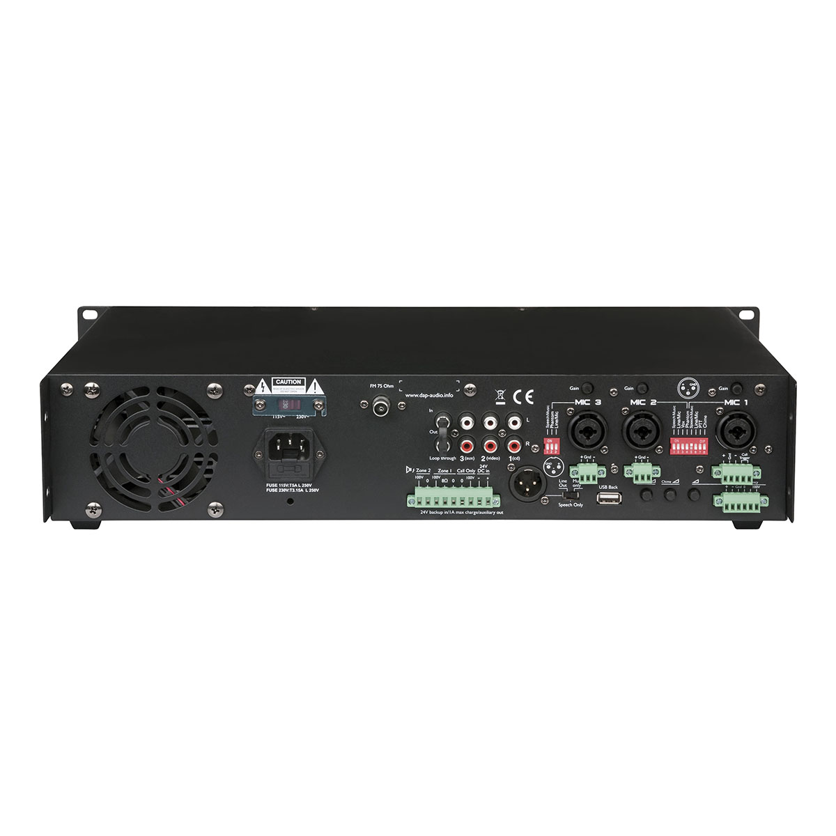 De DAP PA-9120TU is een compacte 120 watt, 100 V-versterker met 7 selecteerbare bronnen, 3 microfooningangen en 2 zones. Alle microfooningangen zijn voorzien van fantoomvoeding en kunnen ook worden gebruikt als line-ingang. Het ingebouwde spraakfilter zorgt voor betere verstaanbaarheid. Op de achterkant bevinden zich drie dedicated line-ingangen, en op de voorkant een speciale line-/telefooningang waarop een MP3-speler of mobiele telefoon kan worden aangesloten.