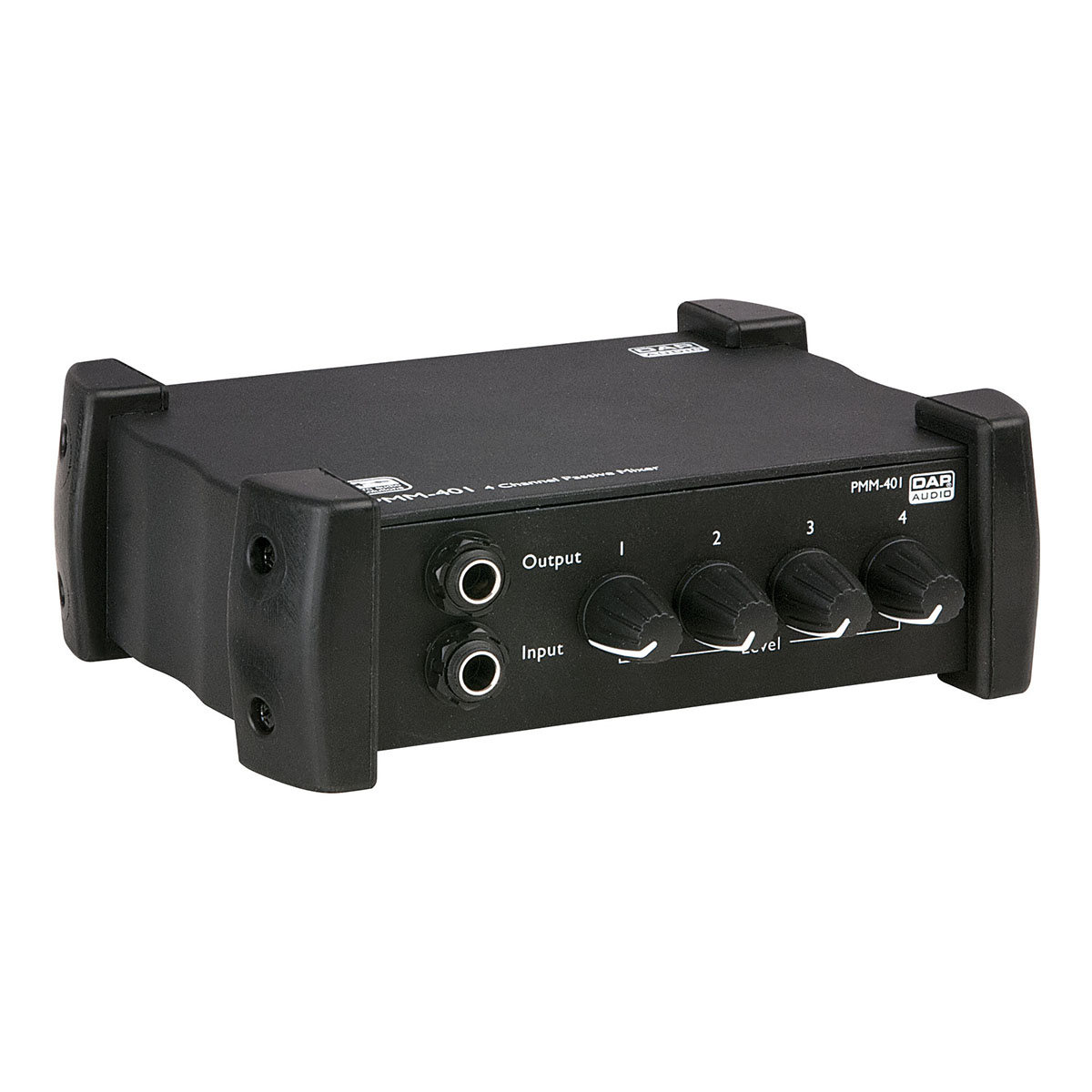 De PMM-401 is een vierkanaals passieve mixer waarmee u uw mixer met extra line-signalen kunt uitbreiden. Het vereist geen batterijen of andere voeding. Het toestel kan als een 1-in-4-out box gebruikt worden wanneer alle besturingselementen helemaal met de klok meegedraaid worden. Het is een handig hulpmiddel in onvoorziene omstandigheden.