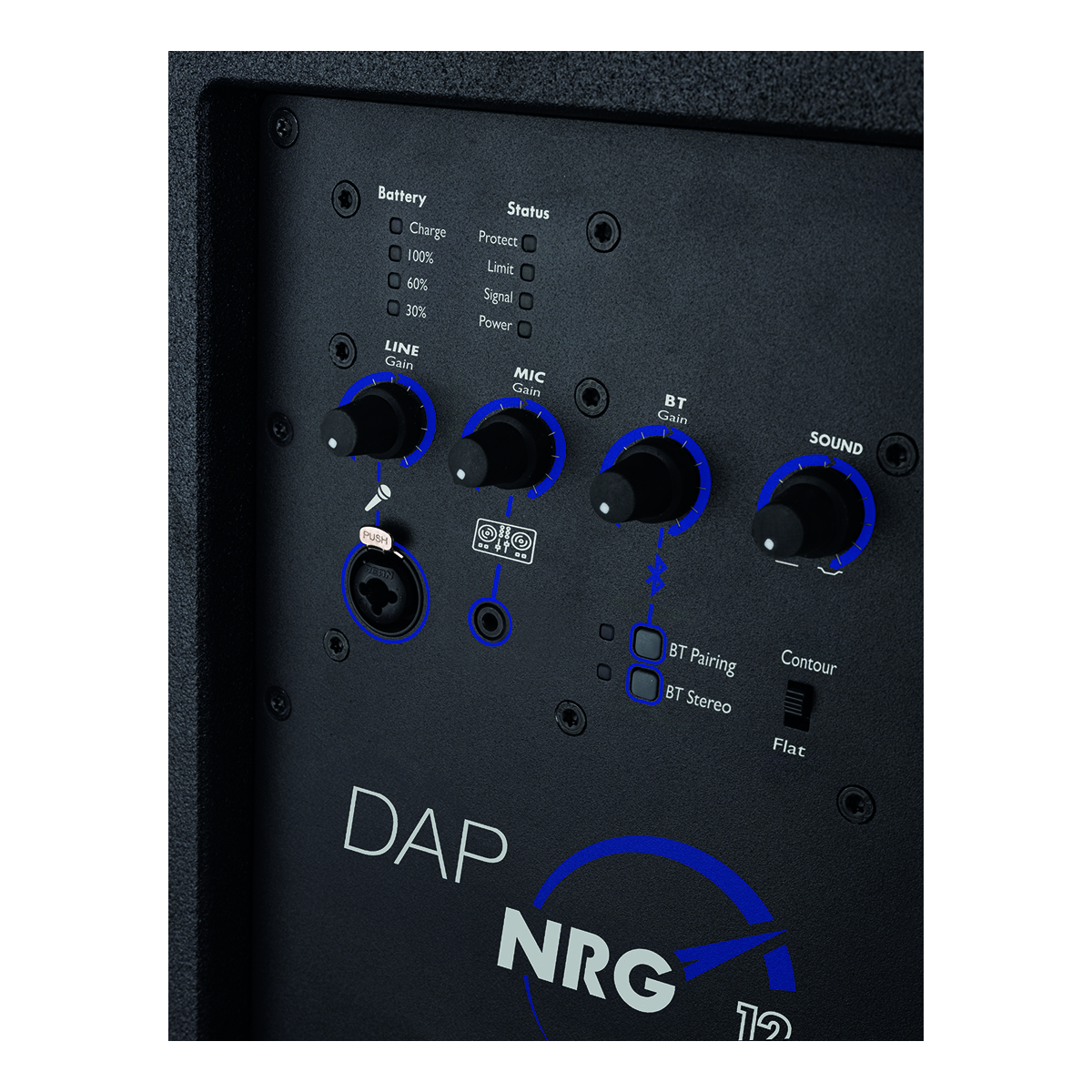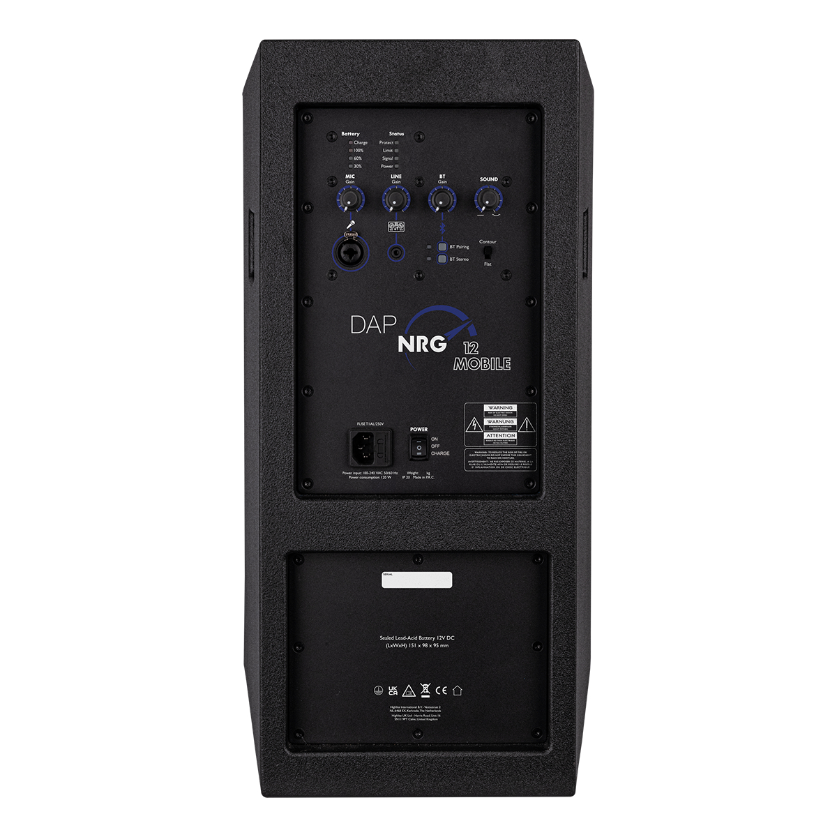 De DAP NRG-12 Mobile is een full-range luidspreker op batterijen met Bluetooth 5.0. Hij heeft een piekvermogen van 200 watt met 120 watt continu RMS-vermogen. Met de los verkrijgbare standaard 12V-batterij heeft de NRG-12 Mobile een werktijd van ongeveer 20 uur bij een gemiddeld volume, meer dan genoeg om elke gelegenheid door te komen. De ingebouwde versterker heeft een 3-pins XLR/jack-combo microfooningang en een mini-jack aux-ingang die elk hun eigen volumeregeling hebben. Er is ook een aparte volumeregelaar voor de Bluetooth-verbinding en de luidspreker biedt True Wireless Stereo bij aansluiting op een tweede luidspreker. De NRG-12 Mobile maakt gebruik van een DSP, en via een EQ-knop kun je schakelen tussen een vlakke instelling, een contourinstelling en alles daar tussenin, zodat je het geluid naar wens kunt aanpassen. LED’s op de achterkant van de speaker geven verschillende statussen aan, zoals wanneer de limiter begint te werken en hoeveel energie de batterij nog heeft.