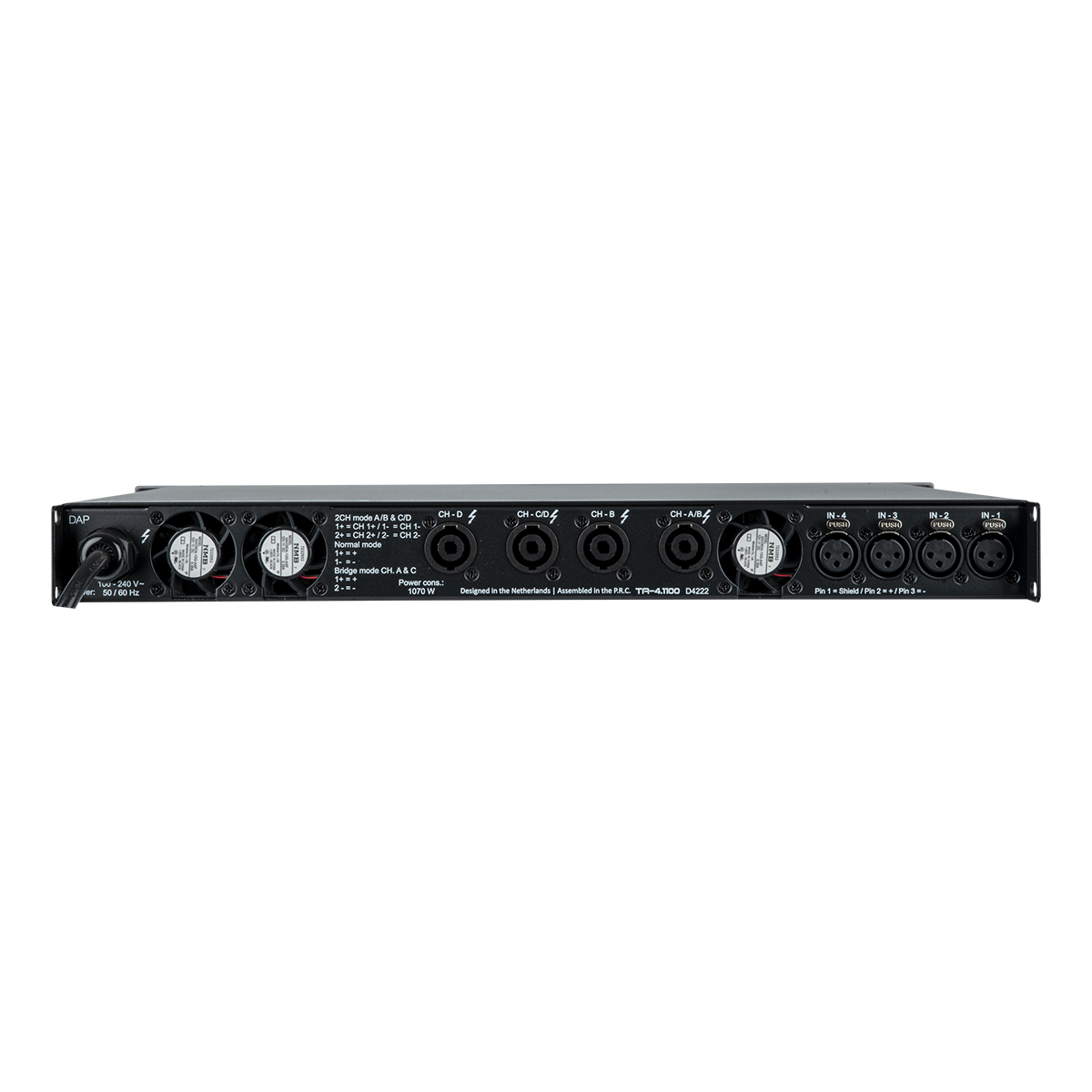 De DAP TA-4.1100 is een compacte en lichte 4-kanaals DSP-eindversterker voor touring-toepassingen. In een 1U rack levert hij 4x 1100 W in 4 ohm, kan hij 2-ohmige belastingen aansturen en kan hij worden gebruikt voor 70V-systemen en kan hij in brugmodus worden gebruikt voor nóg meer vermogen. Hij is ontworpen voor lage impedantie en hoge stroom en bereikt een efficiëntie van meer dan 90% met een uitstekende stabiliteit.