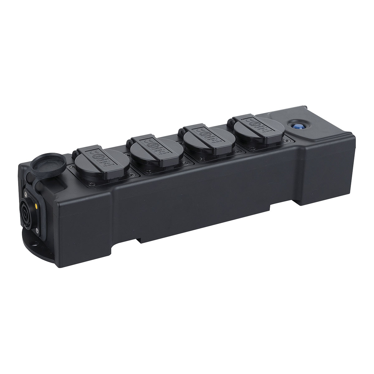 De PowerBOX 4 True1 heeft een PowerCon True1 in-uitgangscombinatie en 1 PowerconTrue1-uitgang aan elke kant, samen met 4 Schuko-voedingsuitgangen.