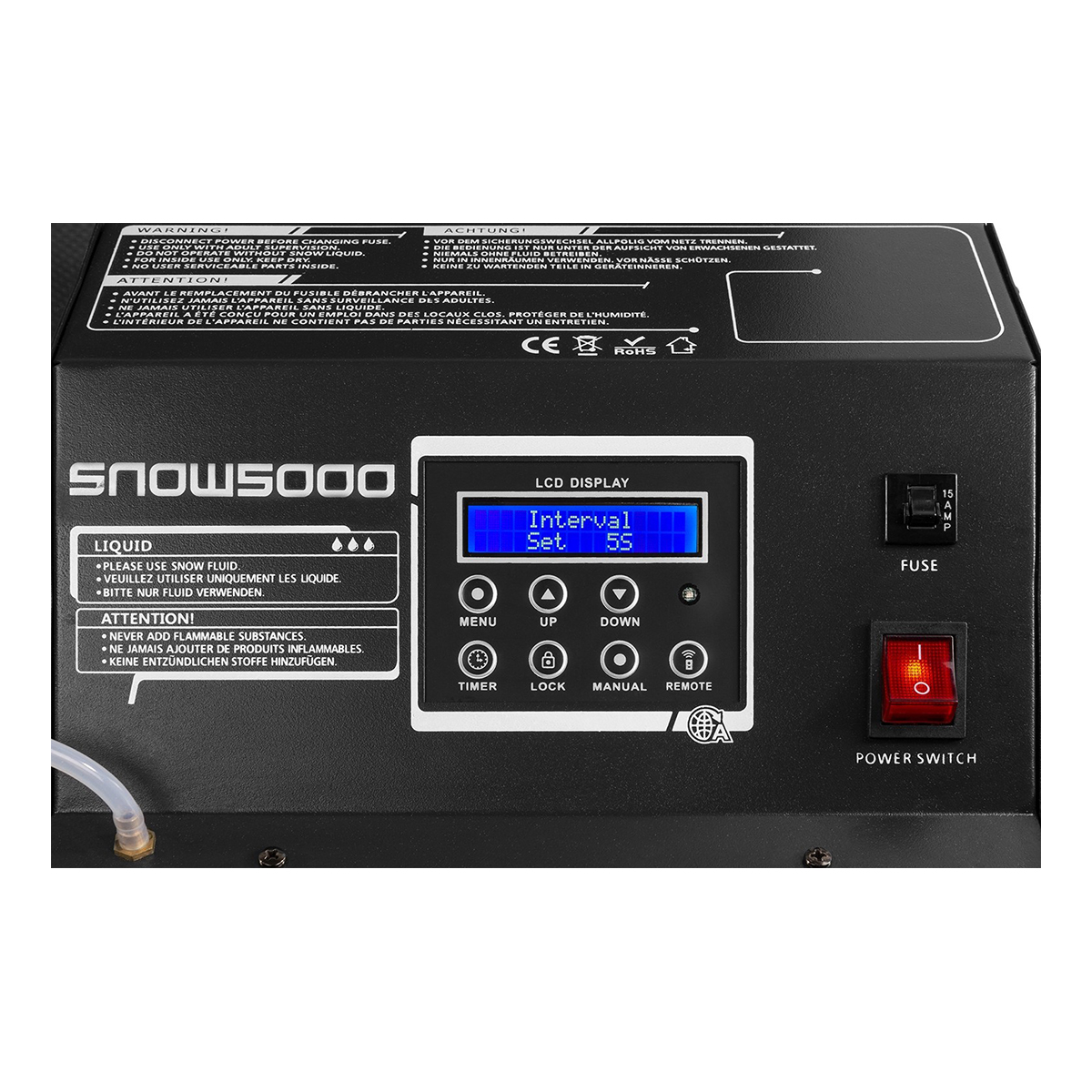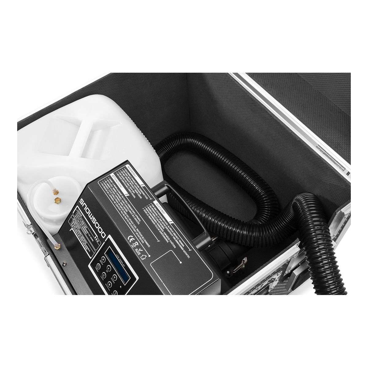 De SNOW5000 produceert zeer grote hoeveelheden kunstmatige sneeuw die op het podium echte sneeuw imiteert! De sneeuw verlaat de machine via het mondstuk dat is bevestigd aan een slang van 10 m , waarbij het luchtvolume en de vloeistofsnelheid kunnen worden aangepast om de perfecte sneeuweffecten te bereiken – van fijne sneeuw tot sneeuwstormachtige omstandigheden! Deze professionele machine en vloeistoftank (20 liter) zijn geplaatst in een stevige flightcase met wielen. De 10 meter lange luchtslang kan eenvoudig op een standaard of in een truss worden gemonteerd met behulp van een standaardklem. Perfect voor gebruik door verhuurbedrijven voor middelgrote en grote producties.
