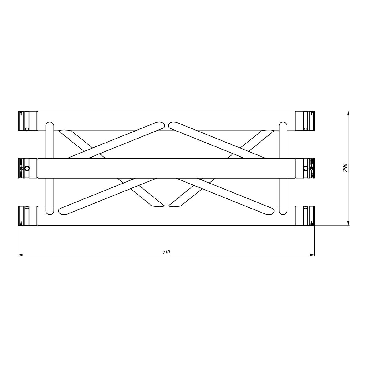 Deze FORTEX FX33 truss driehoek heeft een lengte van 71 cm en wordt gekoppeld door middel van conische koppelingen welke compatible is binnen de Eurotruss range. De hoofdbuizen hebben een doorsnede van 50 mm en een wanddikte van 2 mm, de spijlen zijn 20 bij 2 mm dik.