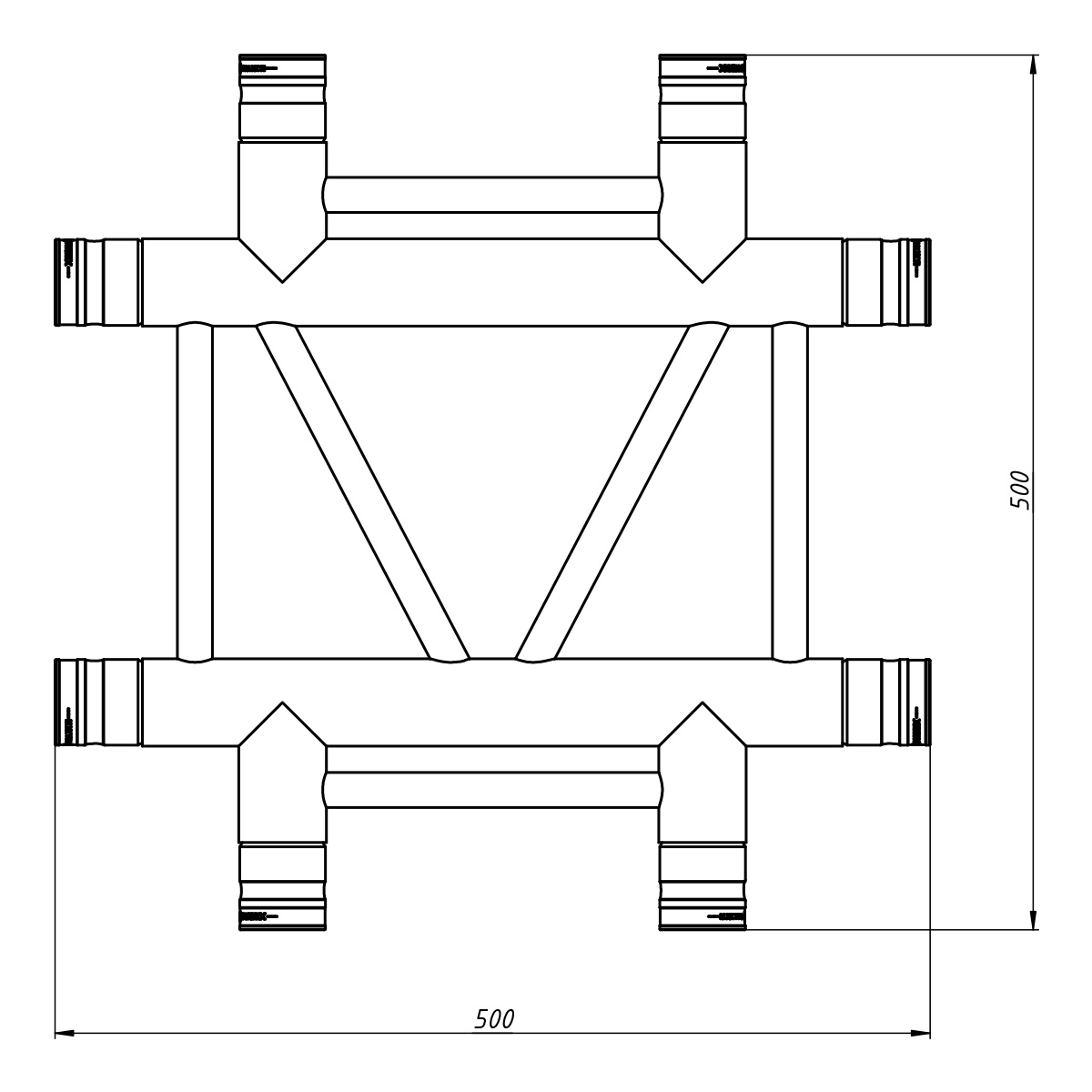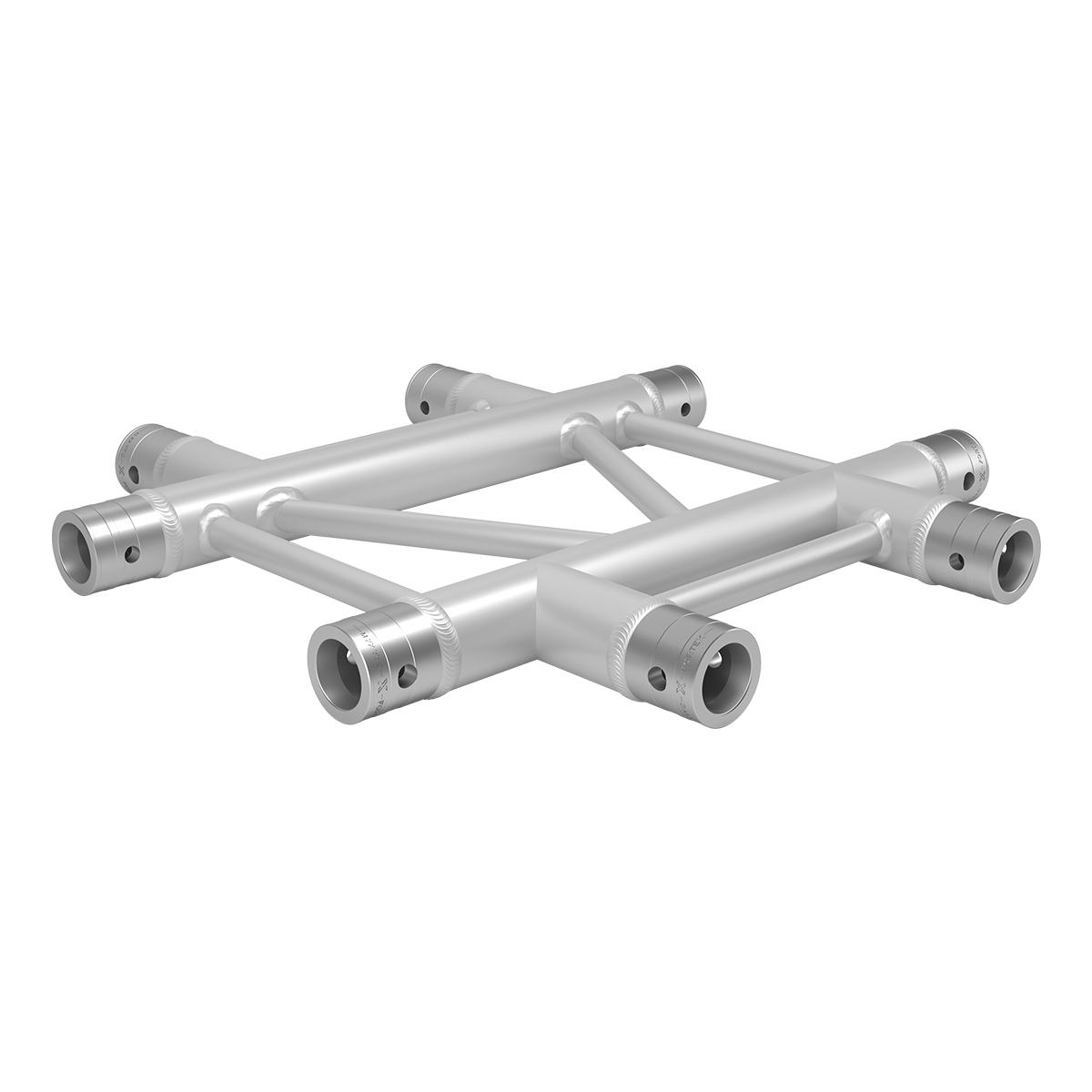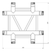 Deze FORTEX FX32-C41-H is een 4-weg kruis horizontaal. De truss wordt gekoppeld door middel van een conische koppelingen welke compatible is binnen de Eurotruss range. De hoofdbuizen hebben een doorsnede van 50 mm en een wanddikte van 2 mm, de spijlen zijn 20 bij 2 mm dik.