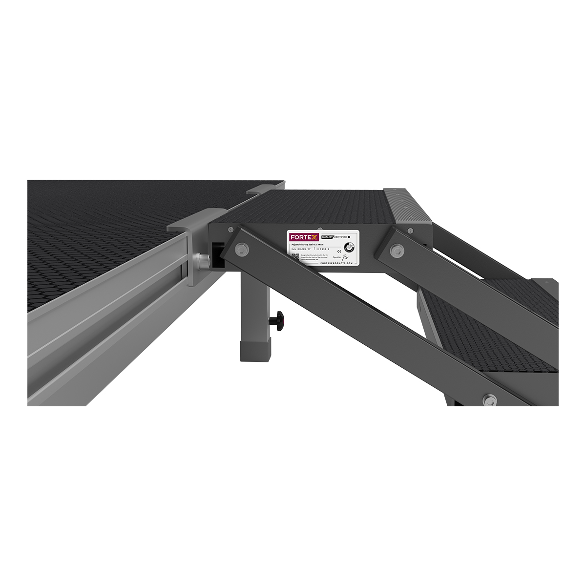 Met de FORTEX verstelbare podium trap ben je flexibel in de podiumhoogte van 100 tot 180cm. De trap is eenvoudig aan de FORTEX STAGE750 deck’s te monteren, met de bijgeleverde adapters.
