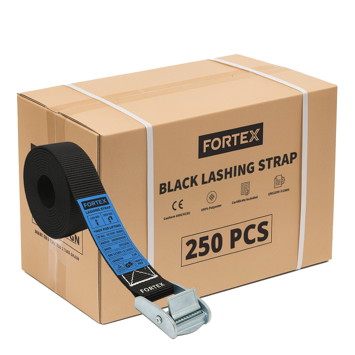 Met een treksterkte van 250 daN biedt de band voldoende kracht voor het vastzetten van lichte tot middelzware onderdelen. De spanband voldoet aan de EN12195-2 normering en wordt geleverd met een itemgebonden certificaat, waarmee de kwaliteit en betrouwbaarheid aantoonbaar zijn volgens de geldende normen voor ladingzekering.