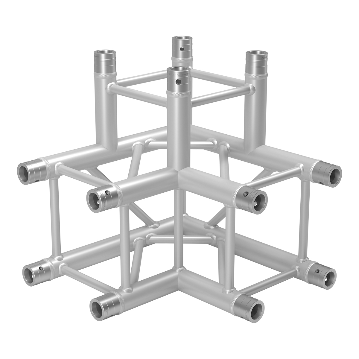 Deze FORTEX FX34-C30 is een 3-weg 90° hoekstuk. De truss wordt gekoppeld door middel van een conische koppelingen welke compatible is binnen de Eurotruss range. De hoofdbuizen hebben een doorsnede van 50 mm en een wanddikte van 2 mm, de spijlen zijn 20 bij 2 mm dik.