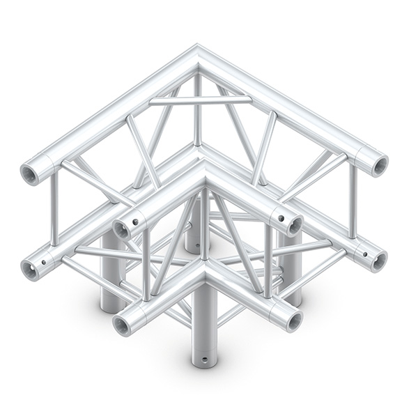 Deze Milos QLF30 truss vierkant is een 90 graden 3-weg hoekstuk en wordt gekoppeld door middel van het ‘F’ koppelsysteem welke compatibel is binnen de Prolyte range. De hoofdbuizen hebben een doorsnede van 50 mm en een wanddikte van 2 mm, de spijlen zijn 16 bij 2 mm dik.