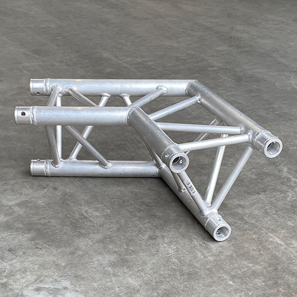 Dit is een truss hoekstuk van de Global Truss F33 serie die vaak mobiel wordt toegepast. De truss heeft drie hoofdbuizen in driehoek vorm wat een stevige constructie vormt. Het gaat hier om een 110 graden 2-weg hoek.