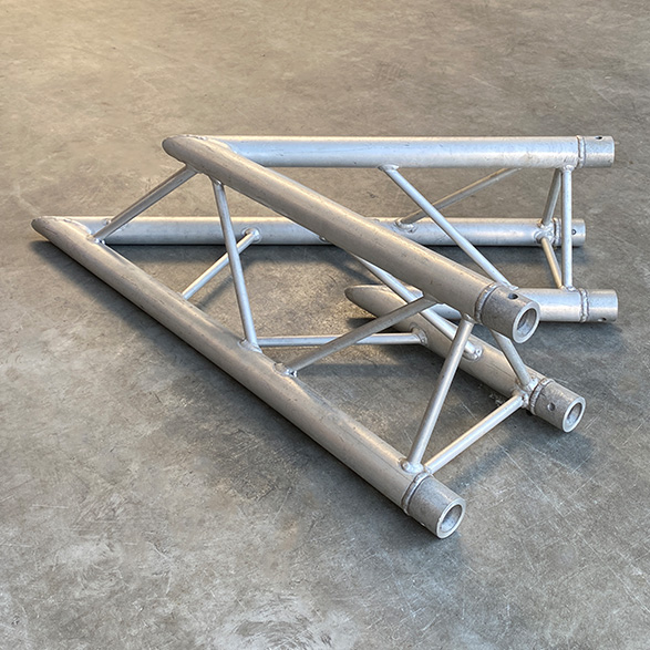 Dit is een truss hoekstuk van de Milos B serie die vaak mobiel wordt toegepast. De truss heeft drie hoofdbuizen in driehoek vorm wat een stevige constructie vormt. Het gaat hier om een 45 graden 2-weg hoek.