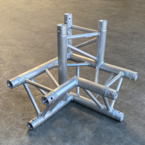 Dit is een truss hoekstuk van de Pro-truss 33 serie die vaak mobiel wordt toegepast. De truss heeft drie hoofdbuizen in driehoek vorm wat een stevige constructie vormt. Het gaat hier om een 3-weg hoek links apex up.
