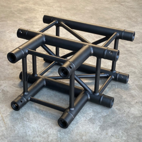 Dit is een truss t-stuk zwart gecoat van de Eurotruss FD34 serie die vaak mobiel wordt toegepast. De truss heeft vier hoofdbuizen in vierkant vorm wat een stevige constructie vormt. Het gaat hier om een 3-weg t-stuk.Dit is het meest gebruikte constructiesysteem voor discotheken, beurzen, podia, theaters en is geschikt voor vele andere doeleinden.