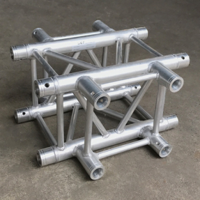 Dit is een truss hoekstuk van de HOF 290-4 serie die vaak mobiel wordt toegepast. De truss heeft vier hoofdbuizen in vierkant vorm wat een stevige constructie vormt. Het gaat hier om een 4-weg kruis.