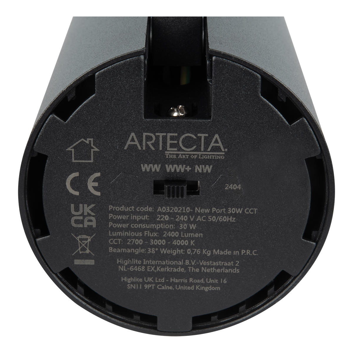 De Artecta New Port 30 W CCT 38° is een dimbare 3-fasen rail LED-lamp met een 3 CCT Switchable White output. Hij heeft een schakelaar aan de achterzijde voor het veranderen van een Warm Witte (2700 K) naar een Neutrale of Koud Witte (4000 K/6000 K) kleurtemperatuur. Deze kleurtemperaturen zijn erg nauwkeurig (>90 CRI).