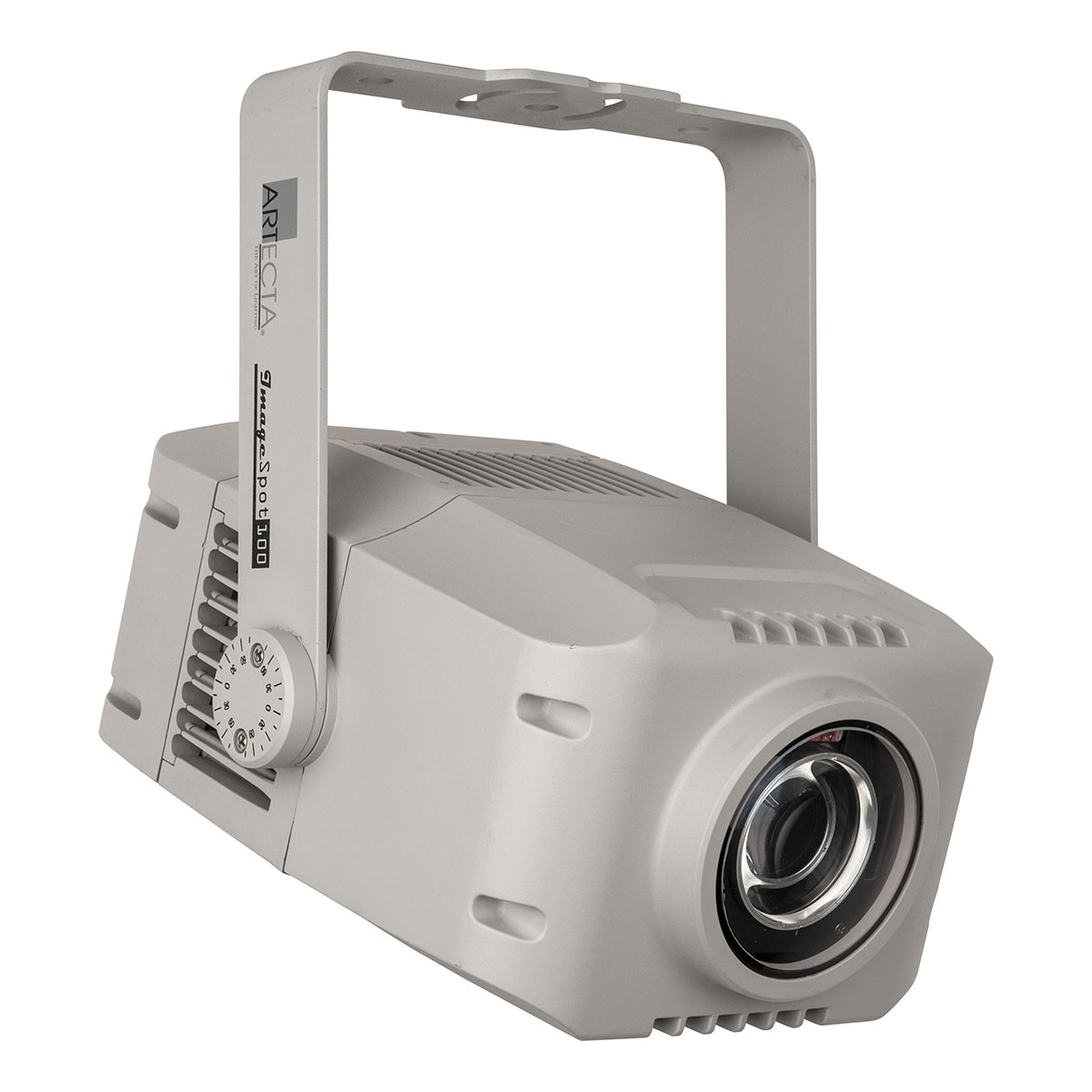 De Artecta Image Spot 100 is een 100 watt gobo projector spot met IP65 rating en hoge >80 CRI, geschikt voor buitentoepassingen. De 7 gobo’s + open kunnen worden geprojecteerd in 7 dichroïde kleuren + wit en kunnen worden geïndexeerd, wat betekent dat de rotatiepositie van de gobo kan worden opgeroepen. Een 3-facet roterende prisma maakt het mogelijk om dynamische effecten te creëren. Bovendien kan een rimpeleffect worden ingeschakeld om golvende vlagpatronen te imiteren en een extra dimensie aan de projectie te geven. De Image Spot 100 is uitgerust met een instelbare 10° – 30° zoomfunctie inclusief zoom functie om de projector precies op maat te krijgen. Alle parameters kunnen handmatig en via DMX worden aangepast. Er kunnen zeven scènes worden geprogrammeerd en opgeslagen voor stand-alone gebruik.