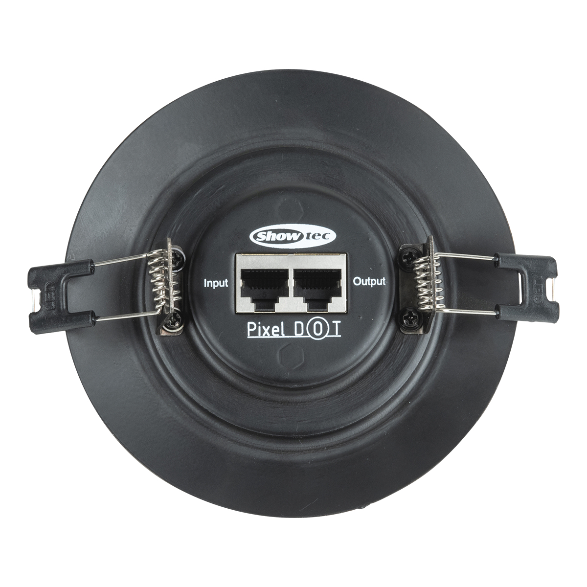 De Showtec PixelDot is een in serie schakelbare RGB LED Dot met zwarte behuizing en een mat witte 50 mm cover, geschikt voor kleurmenging bij vaste plafond installaties. Aangestuurd door de speciale Pixelcontroller, kan de PixelDot gemakkelijk in serie worden geschakeld op elke gewenste manier met behulp van een enkele Cat-kabel tot 40 eenheden per PixelController uitgang en tot 160 Pixeldots per Pixelcontroller. Uitgerust met veerklemmen, is de installatie van de PixelDots net zo eenvoudig als gewone inbouwspots. Een RJ45-kabel van 50 cm wordt meegeleverd.
