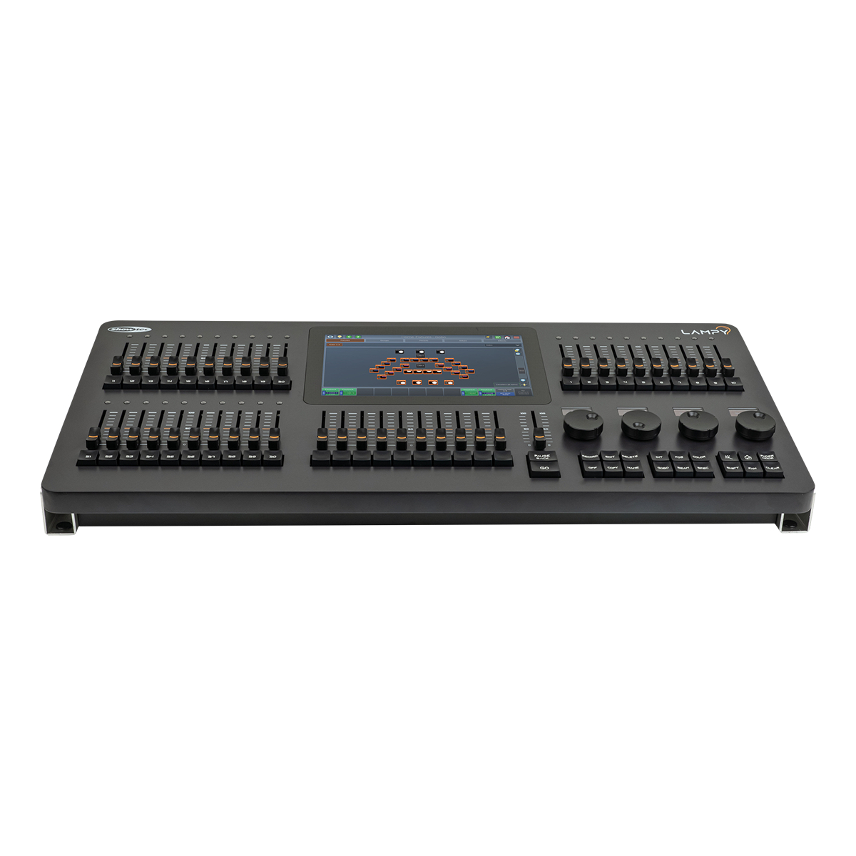 Indien 10 multifunctionele faders en 10 playback faders met cue-knoppen voldoende zijn voor je activiteiten, raden we je aan om onze LAMPY 20 te bekijken met 10 in plaats van 30 multifunctionele faders met behoud van 9 geheugen pagina’s voor voldoende opslagruimte.