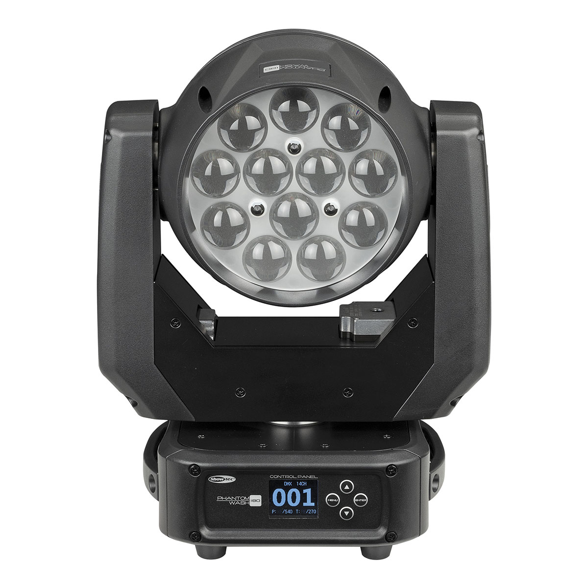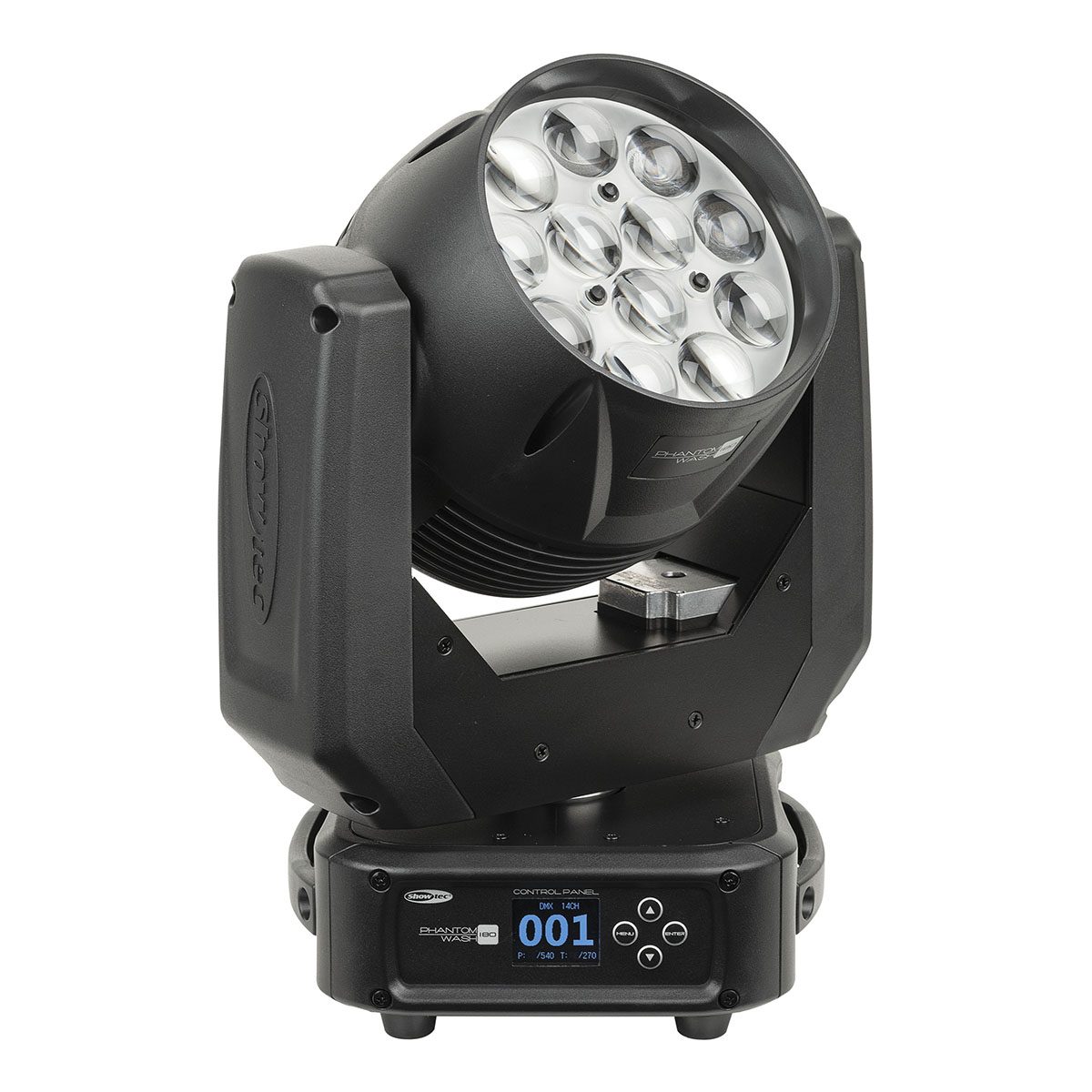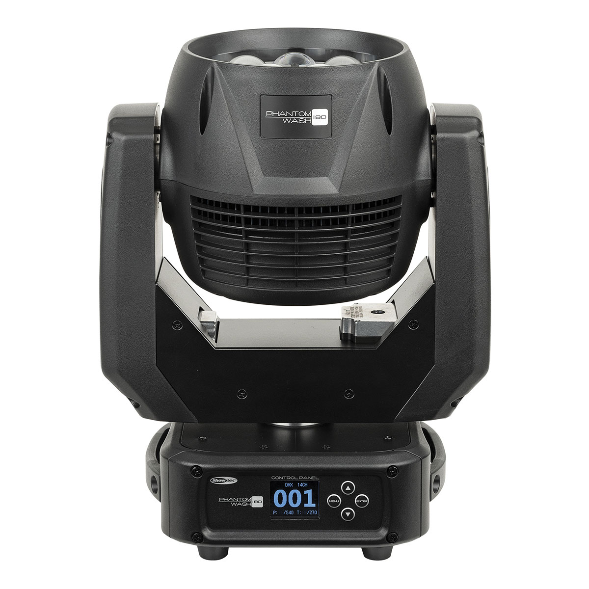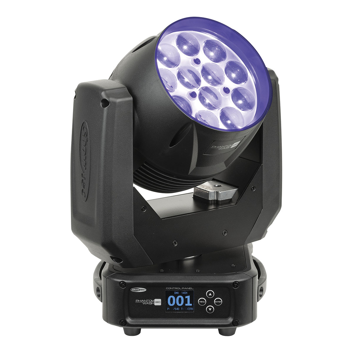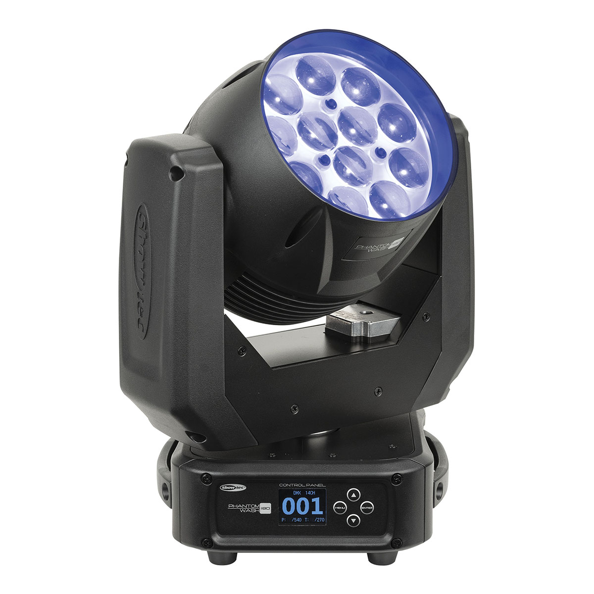De Showtec Phantom 180 Wash is een RGBW-wash movinghead met een gemotoriseerde zoom van 7°-50°. Het apparaat is uitgerust met 12 krachtige RGBW-leds van 15 watt, die zijn verdeeld in 4 afzonderlijk bestuurbare secties. Dimbaar van 0% tot 100% en met een ingebouwde stroboscoopfunctie van 0 tot 20 Hz. Pan- en tiltbewegingen zijn nauwkeurig, snel en programmeerbaar.