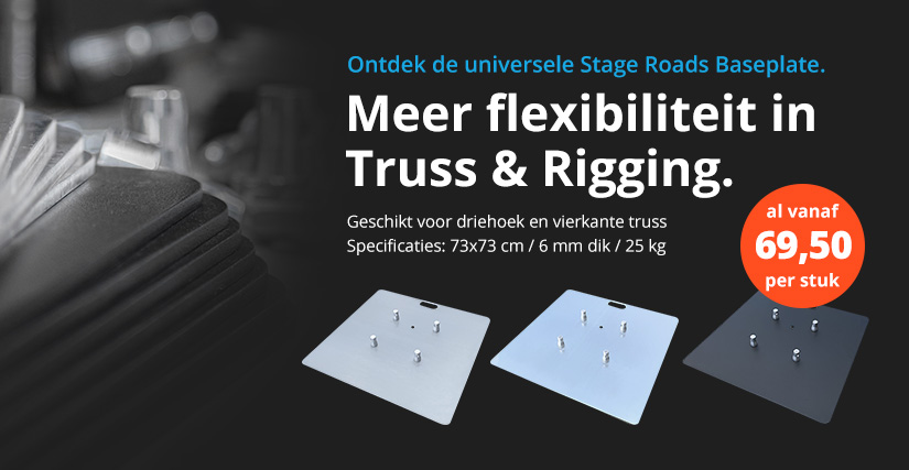 De Stage Roads baseplate geeft je meer flexibiliteit in truss en rigging. De 6 mm dikke stalen plaat is een uitstekende basis voor vrijstaande objecten. De Stage Roads baseplate levert 25 kg extra gewicht voor elke truss-basis. Met deze solide baseplate is het mogelijk om alles van truss-poorten tot trusspalen met een verlichtingsarmatuur erop te bouwen. Ideaal voor stagesystemen, standbouw, podiumbouw en theatertechniek.