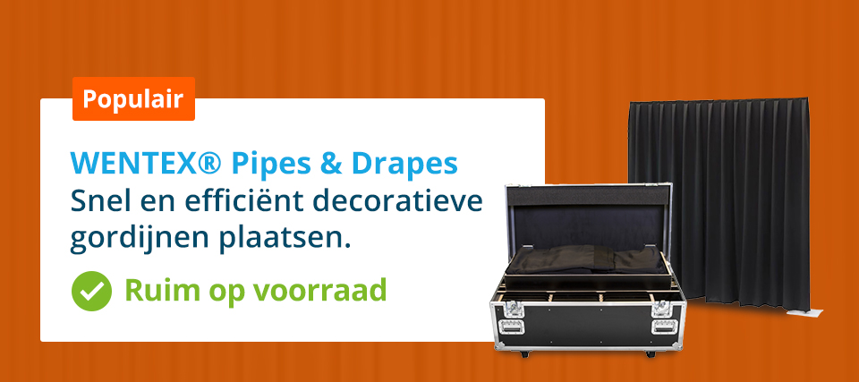 Pipe & drape complete sets. Gemakkelijk samengestelde sets Pipe & drape bestellen inclusief transportmiddelen. Veel gebruikt door verhuurders. Dit veelzijdige decoratieve en verplaatsbare scheidingssysteem kan in vele soorten situaties worden toegepast. Pipe & drape kan worden geplaatst op beurzen, productpresentaties of feesten. Hiermee creëer je een net en chique ogende achtergrond of tover een kale ruimt om tot een professioneel ogende ruimte. Het systeem bestaat uit staanders, baseplates, ophangbuizen en accessoires die allen in een set zijn samengesteld.